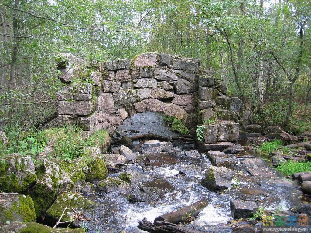 После гонки и небольшого чаепития на берегу Вуоксы, совмещённого с наблюдением за штурмующими порог водниками, поехали ночевать на озера неподалёку. А под дороге очень удачно расположился тайник "Финская мельница". Ручей в лесу между двумя озёрами, очень живописный мелкий брод с приятным песочком и камешками под ногами, поросшие мхом каменные развалины.